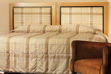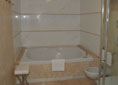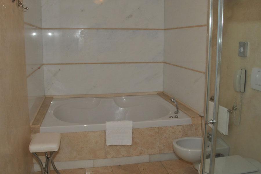 bed or twin beds and a travertine and marble bathroom with double washbasins.