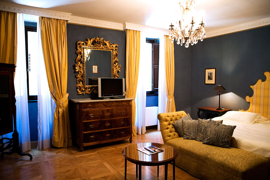 Welcome to the Palazzo. Our Deluxe Junior Suites will give you a real taste of the ancient splendour of an aristocratic residence beautifully matched with all the comforts of modern technology. Time seems to have its own rhythm here, your image is reflected in ornate Baroque mirrors while an inviting armchair relaxes you as you check an email on your tablet.