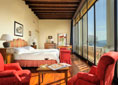 area, views of the garden and the panorama beyond, a wood-beamed ceiling, marble