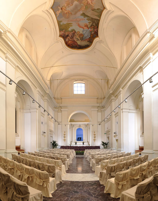 After having hosted an event in Sala Bernini, the oratory of the former convent, the desire to always organize events here is hard, if not impossible, to resist. The great and solemn events that have taken place here over the centuries still seem to linger in the air of this sumptuous Salone. As we enter our eyes immediately fall on the commemorative bust of Pope Innocent XI sculpted by Berardo Adrizzoia and looking up we find the extraordinary 18th century fresco painted by Giacomo Triga. Even the 75m² foyer of the Sala Bernini is beautifully furnished with sculptures and paintings by Fabio Sinisca.